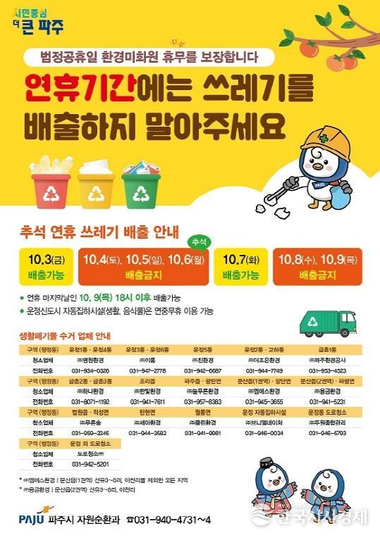 한국시사경제 경기북부취재본부 | 파주시는 환경미화원 휴무 보장을 위해 추석 연휴 기간인 10월 4일부터 10월 6일, 10월 8일부터 10월 9일까지는 생활폐기물을 배출해서는 안 되며, 이 기간 동안에는 생활쓰레기 수거가 중단된다고 밝혔다.