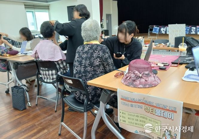 한국시사경제 문화팀 | 인천 미추홀구학교밖청소년지원센터는 지난 26일 직업훈련을 받은 학교 밖 청소년 6명이 어르신을 대상으로 메이크업과 추억을 남길 수 있는 기념사진 촬영을 진행했다.