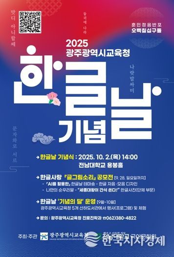 특히 9월에 실시한 ‘한글사랑 글그림소리 공모전’ 시상을 한다. 이번 공모전은 광주지역 초·중·고·대학생을 대상으로 ’AI를 활용한 한글날 테마송 공모전‘, ’한글 자음·모음 디자인 공모전‘, ’나만의 순우리말 공모전(엽서쓰기), 한글 사진 단체 공모전 ‘세종대왕이 간식 쏜다!’ 등으로 진행됐다.