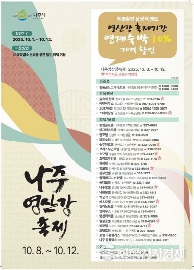 한국시사경제 전남취재본부 | 전라남도 나주시가 오는 10월 8일부터 12일까지 열리는 ‘2025 나주영산강축제’ 기간 동안 지역 숙박업소와 함께하는 숙박 특별할인 상생 이벤트를 마련했다.