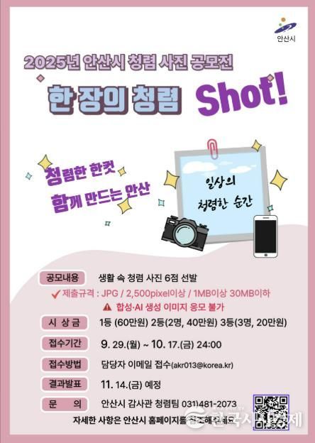 한국시사경제 권충현 기자 | 안산시는 청렴문화 확산과 시민 공감대 형성을 위해 ‘2025 한 장의 청렴, Shot! 사진 공모전’을 개최한다고 30일 밝혔다.