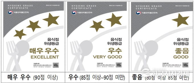 식품의약품안전처에서 주관하는 위생등급제는 음식점의 위생 수준을 평가하는 제도로 영업장의 전반적인 위생 상태 등 44개 항목에 대해 매우 우수, 우수, 좋음의 3단계로 등급을 부여한다.