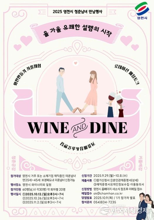 한국시사경제 경북취재본부 | 영천시는 오는 10월 12일, 10월 26일, 11월 2일 세 차례에 걸쳐 관내 와이너리에서 미혼남녀를 위한 특별한 만남 프로그램 ‘2025 영천愛 와인·다인(wine·dine)’을 개최한다.