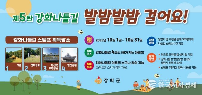 한국시사경제 문화팀 | 강화군은 10월 한 달간 강화나들길 활성화를 위해 ‘제5탄 강화나들길 발밤발밤 걸어요!’ 챌린지를 진행한다고 밝혔다.