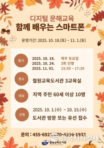 한국시사경제 이정이 기자 | 철원교육도서관은 지역 고령층의 디지털 활용 능력 향상과 격차 해소를 위해 오는 10월 18일부터 11월 1일까지 매주 토요일, 총 3회에 걸쳐 ‘함께 배우는 스마트폰’ 디지털 문해교육을 운영한다.