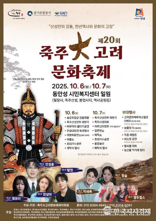 죽주대고려문화축제위원회는 오는 10월 6일부터 7일까지 이틀간 동안성시민복지센터 일원에서 제20회 죽주대고려문화축제를 연다고 밝혔다. 올해 축제는 ‘산성안의 감동, 천년역사와 문화의 고장’을 주제로, 송문주 장군과 죽주산성 전투의 역사적 의미를 기리고 지역 문화예술을 널리 알리기 위해 마련됐다.