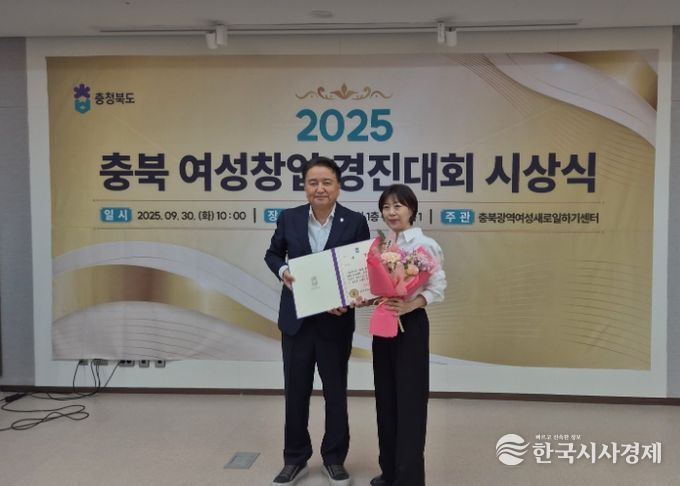 한국시사경제 충북취재본부 | 지난 9월 30일 충청북도의회 워크숍실에서 열린 ‘2025 충북 여성창업 경진대회’에서 제천여성새로일하기센터 지연옥씨(바닐라유닛/사용자 프로파일 기반 AI 지역정보 추천 플랫폼 ‘오늘의 제천’)가 우수상을 받았다.