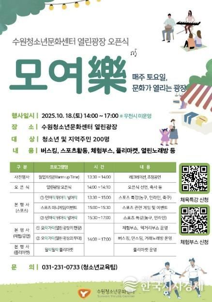 한국시사경제 기동취재팀 | 수원시청소년청년재단 청소년문화센터는 오는 10월 18일 청소년문화센터 야외광장에서'열린광장 오픈식‘모여락(樂')을 개최한다.