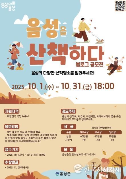 한국시사경제 오영주 기자 | 음성군이 지역 곳곳의 아름다운 산책 명소의 매력을 알리기 위해 지난 1일부터 이달 31일까지 ‘2025년 음성군 블로그 공모전’을 개최한다.