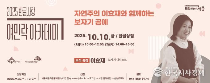 한국시사경제 세종취재분부 | 세종시문화관광재단(대표이사 박영국)은 ‘2025 한글사랑 여민락 아카데미 추석 특별강좌’를 오는 10월 10일 진행한다.