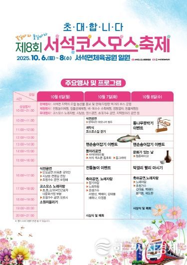 라주호 축제위원장은 “코스모스 향연과 함께 주민이 직접 참여하는 먹거리와 농특산물 판매장이 축제의 진정한 매력이 될 것”이라며, “추석 연휴 동안 많은 분들이 서석면을 찾아 맛과 멋, 그리고 따뜻한 정을 함께 나누길 바란다”라고 전했다.