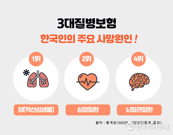 한국시사경제 권충언 기자 | 3대질병으로 일컬어지는 암, 뇌혈관질환, 심혈관질환은 한국인의 주요 사망원인에서 상위를 차지하고 있으며, 이에 대한 진단비를 집중적으로 보장해 주는 보험상품을 3대질병진단비 보험이라 할 수 있다.