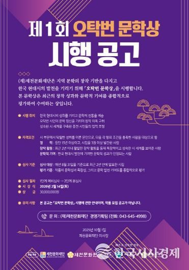 한국시사경제 충북취재본부 | (재)제천문화재단(이사장 김상수)은 지역 문학의 창작 기반을 다지고 한국 현대시의 발전을 기리기 위해 제천문화재단 제1회'오탁번 문학상'을 공고했다. 이번 문학상은 최근의 창작 성과와 문학적 기여를 종합적으로 평가하여 수여하는 상으로, 오탁번 시인의 문학 정신을 기리고 문학적 전통을 계승하는데 그 취지가 있다.
