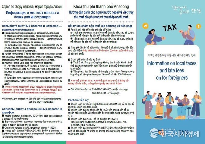이에 따라 외국인 맞춤형 납세 홍보 수단으로 기존의 영어·중국어·베트남어 3개국 언어로 제작한 체납 안내 리플렛에 러시아어를 추가하여 4개국 언어로 새롭게 제작했고, 포스터, 안내 전단지 등과 함께 외국인 관련 시설 및 단체와 읍·면·동사무소에 비치한다. 외국인이 많이 거주하는 지역에 대한 집중 홍보를 통해 납부 방법과 체납에 따른 불이익을 안내하여 자진납부할 수 있도록 유도할 계획이다.