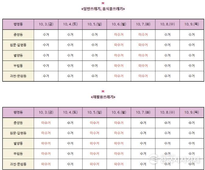 생활폐기물 수거는 일반 쓰레기의 경우 3일, 4일, 5일, 8일, 9일에, 재활용 쓰레기는 4일, 7일, 8일, 9일에 각각 수거된다.