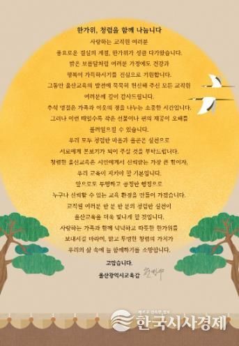 한국시사경제 울산취재본부 | 울산광역시교육청은 추석을 앞두고 1일 울산 지역 전 교육기관과 학교 교직원들에게 청렴 의지를 다지는‘청렴 서한문’을 보냈다.