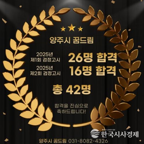 한국시사경제 경기북부취재본부 | 양주시 학교밖청소년지원센터 소속 청소년 42명이 지난 4월과 8월 실시된 2025년 초·중·고등학교 검정고시에 합격했다.