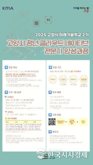 한편고양시는 오는 10월부터 '미래기술학교 2기 – 고양시 청년 클라우드 네이티브 전문가 양성과정'을 운영할 예정으로, 9월 4일부터 10월 12일까지 잡아바 어플라이를 통하여 교육생을 모집한다.