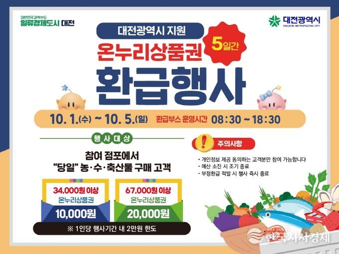 이번 행사는 농림축산식품부·해양수산부가 주관하는 전국 환급행사와 연계해 추진되며, 대전시민이 더 많은 혜택을 체감할 수 있도록 지역 전통시장에서 별도 운영된다.