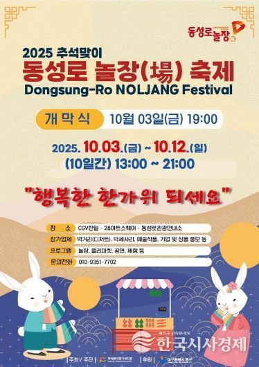 한국시사경제 대구취재본부 | 대구 중구는 10월 3일부터 12일까지 10일간 동성로 보행자전용도로 일원에서 ‘동성로에서 놀며 장보자!’라는 테마로 ‘2025 추석맞이 동성로 놀장(場) 축제’를 개최한다.