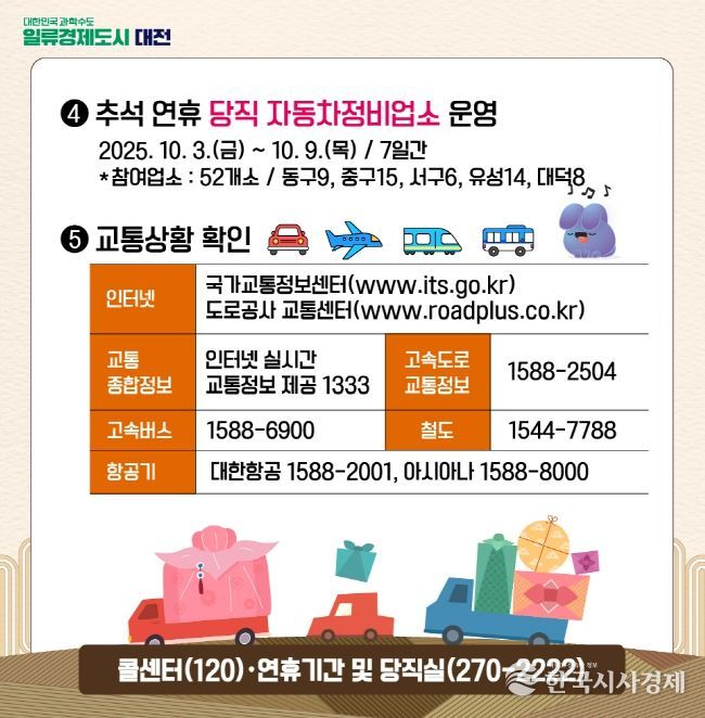 장거리 운행 중 고장에 대비해 동구·중구·서구·유성구·대덕구에서 총 52개 당직 자동차정비업소가 운영되며, 운수종사자를 대상으로 한 교통안전·친절교육과 교통시설물 사전 점검도 이미 완료됐다.