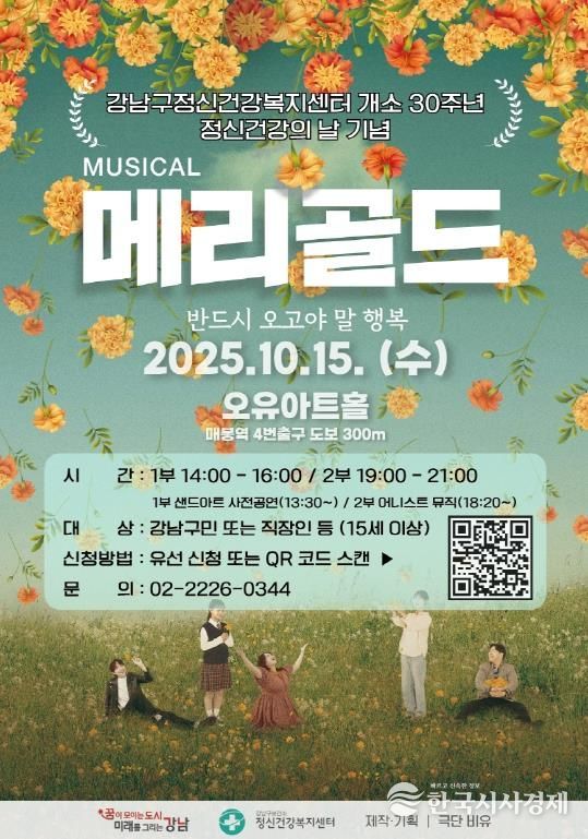 한국시사경제 권충현 기자 | 꿈이 모이는 도시, 미래를 그리는 강남구가 정신건강복지센터 개소 30주년과 세계정신건강의 날(10월 10일)을 기념해, 오는 10월 15일 오후 2시와 7시, 오유아트홀(남부순환로378길 34-9)에서 구민과 함께하는 특별 뮤지컬 ‘메리골드 – 반드시 오고야 말 행복’을 개최한다.