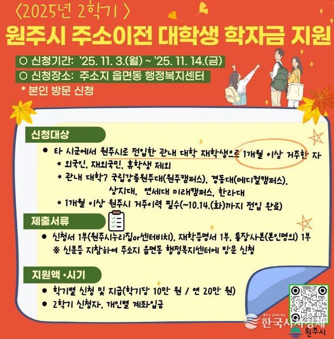 한국시사경제 권충언 기자 | 원주시는 전입신고를 마치고 원주시민이 된 관내 대학생에게 상·하반기 각 10만 원씩 연 20만 원의 학자금을 지원하고 있다.