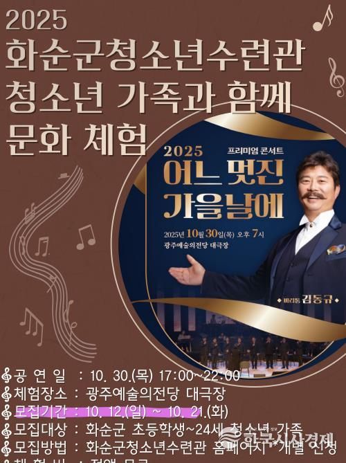 한국시사경제 이정이 기자 | 화순군은 2일 청소년수련관에서 짙어가는 가을의 정취 속에 청소년과 가족이 함께하는 특별한 문화체험, 바리톤 김동규의 프리미엄 콘서트'어느 멋진 가을날'을 관람할 청소년 가족 60명을 선착순 모집한다고 밝혔다.