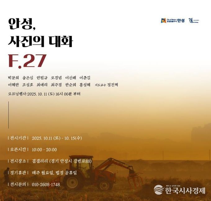 한국시사경제 경기취재본부 | 안성시 사진동아리 F.27 photo가 오는 10월 11일부터 15일까지 안성천 작은미술관 결갤러리에서 전시회 ‘안성, 사진의 대화 F.27’을 개최한다. 이번 전시는 동아리 회원 18명이 참여해 안성의 자연환경과 사람들의 이야기를 기록한 작품을 선보인다.
