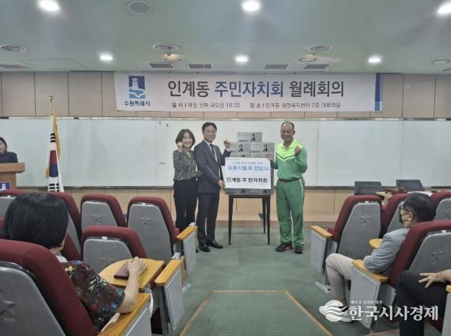 한국시사경제 사회팀 | 수원시 팔달구 인계동 주민자치회는 지난 10월 1일, 가을철 관내 낙엽청소용 송풍기 벨트(100만 원 상당)를 인계동 행정복지센터에 전달했다.