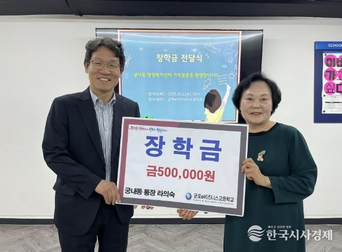 한국시사경제 사회팀 | 라의숙 군포시 궁내동통장협의회장은 10월 1일 군포e비즈니스고등학교에 장학금을 전달하며 지역 청소년들의 꿈을 응원하는 뜻깊은 나눔을 실천했다.