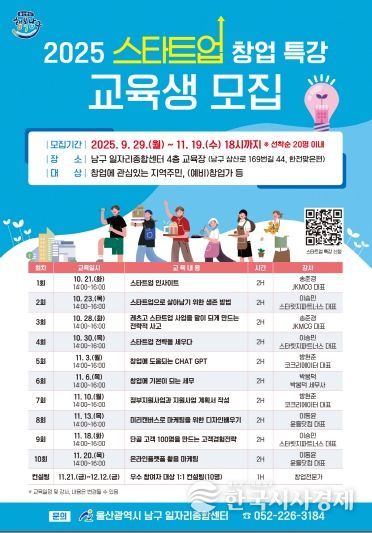 한국시사경제 울산취재본부 | 울산 남구 일자리종합센터는 창업 역량 강화와 성공적인 창업 준비 기반을 마련하는 데 실질적인 도움을 주고자 ‘2025년 스타트업 창업 특강’교육생을 모집한다고 밝혔다.
