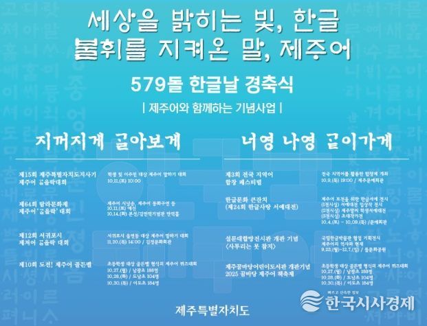 한국시사경제 한장선 객원기자 | 제주특별자치도는 훈민정음 반포 579돌 한글날을 맞이해 오는 9일 오전 10시 제주문예회관에서 한글날 경축식을 개최한다.