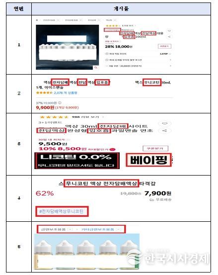 한국시사경제 윤경수 기자 | 식품의약품안전처는 시중에서 판매되는 ‘무니코틴 표방 액상 흡입제품’에 대해 ‘의약외품(니코틴이 포함되지 않은 흡연욕구저하제, 흡연습관개선보조제)’ 오인 우려 광고로 보아 지난 9월 집중 점검을 실시했다.