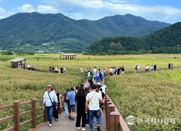 한국시사경제 문화팀 | 추석 연휴 순천만습지를 찾은 방문객들이 가을 정취 속에서 갈대밭 산책을 즐기고 있다.