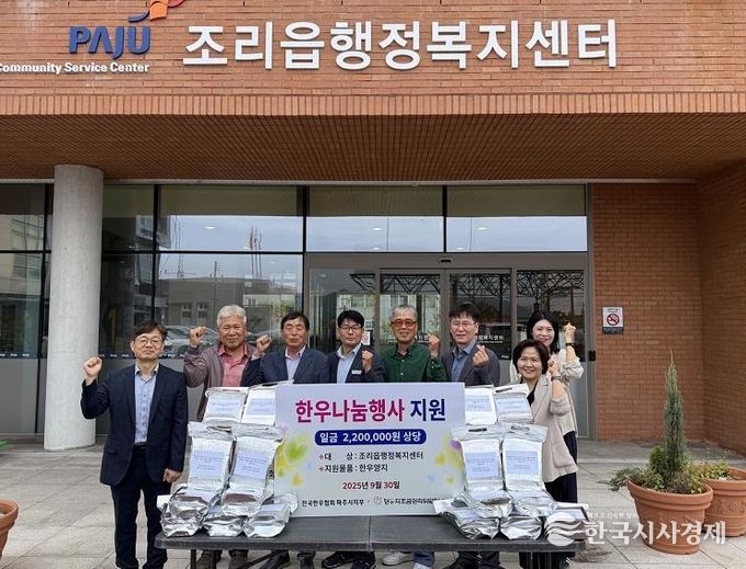 한국시사경제 경기북부취재본부 | 파주시 조리읍은 지난 9월 30일 전국한우협회 파주시지부로부터 추석 명절을 맞아 220만 원 상당의 한우 양지 43kg을 기탁 받았다고 전했다.