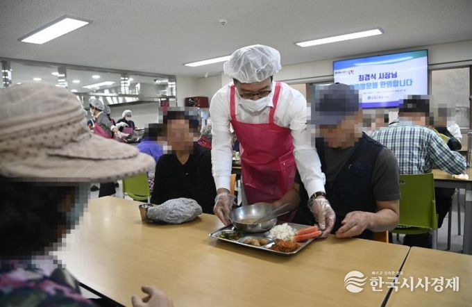 한국시사경제 전북취재본부 | 최경식 남원시장이 지난 10일 기능보강이 완료된 남원사회복지관 경로식당을 방문해 배식 봉사를 진행하며 어르신들과 소통하는 시간을 보냈다.