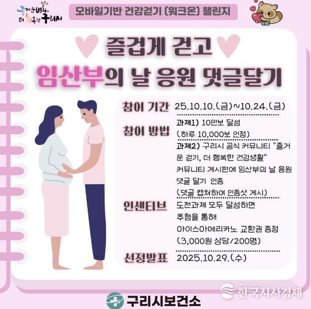 한국시사경제 경기취재본부 | 구리시는 제20회‘임산부의 날’(10월 10일)을 기념해 임신과 출산의 가치를 되새기고 시민 건강 증진을 도모하기 위한 ‘즐겁게 걷고, 임산부의 날 응원 댓글 달기’ 챌린지를 오는 10월 10일부터 24일까지 15일간 운영한다고 밝혔다.