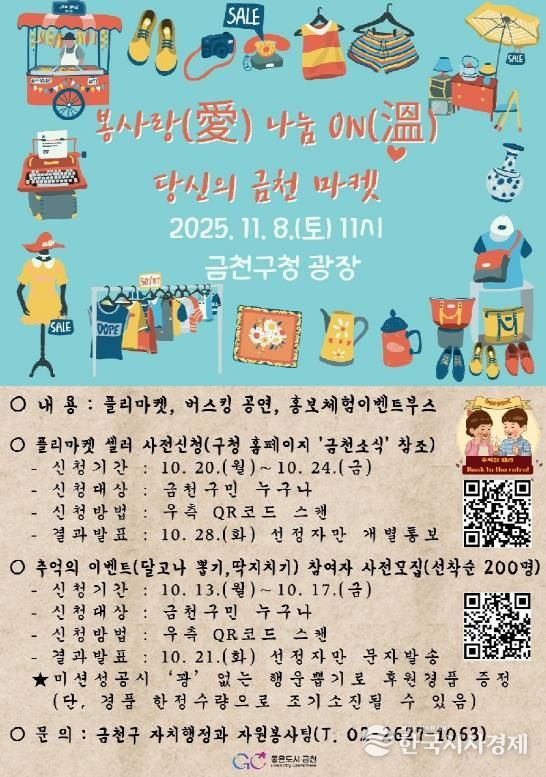 한국시사경제 김숙영 기자 | 금천구는 오는 11월 8일 금천구청 광장 앞에서 ‘봉사랑(愛) 나눔ON(溫), 당신의 금천마켓’을 연다고 밝혔다.