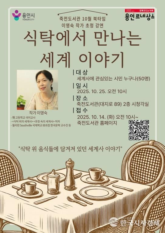 한국시사경제 사회팀 | 용인특례시는 25일 오전 10시 죽전도서관 시청각실에서 죽전도서관 북타임 작가초청강연회 ‘식탁에서 만나는 세계 이야기’를 연다고 13일 밝혔다.