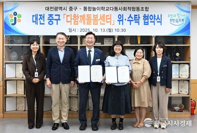 한국시사경제 대전취재본부 | 대전 중구는 13일 통합놀이학교다동 사회적협동조합(대표 이미라)과 다함께돌봄센터 석교1호점 위수탁 운영협약을 체결했다고 밝혔다.