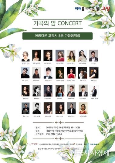 한국시사경제 윤광희 기자 | 고양특례시가 후원하고, (사)한국예술문화단체총연합회 고양지회가 주최하며 (사)한국음악협회 고양지부가 주관하는 ‘2025 가곡의 밤 – 아름다운 고양시 8경(景) 가을 음악회’가 오는 16일 오후 7시 30분, 고양아람누리 아람음악당에서 개최된다.