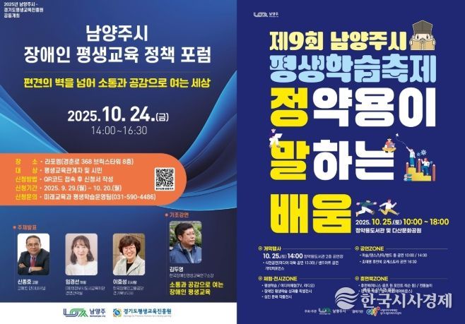 한국시사경제 경기북부취재본부 | 남양주시는 장애인과 비장애인이 함께 어우러지는 평생학습 환경 조성과 모두를 위한 평생학습 가치공유 및 활성화를 위해 오는 24일 ‘장애인 평생학습포럼’, 25일 ‘평생학습축제’를 연이어 개최한다고 밝혔다.
