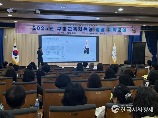 한국시사경제 경북취재본부 | 경상북도구미교육지원청(교육장 민병도)은 10월 13일 구미교육지원청 신청사 1층 다목적강당에서 관내 학교 계약업무 담당자를 대상으로 ‘2025년 구미교육지원청 청렴 계약교실’ 연수를 실시했다.