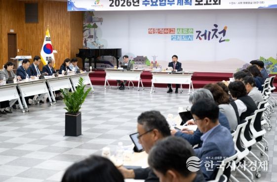 한국시사경제 충북취재본부 | 제천시는 지난 13일 시청 청풍호실에서 김창규 시장 주재로 국장 및 직속기관장, 부서장이 참석한 가운데 2026년 주요업무계획 보고회를 개최했다.
