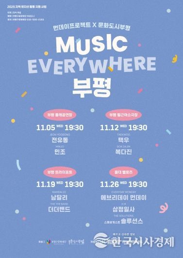 한국시사경제 문화팀 | 부평구 문화재단 문화도시센터는 오는 11월 매주 수요일 오후 7시 30분 지역 뮤지션들의 공연 ‘MUSIC EVERYWHERE 부평’을 총 4회에 걸쳐 진행한다고 밝혔다.