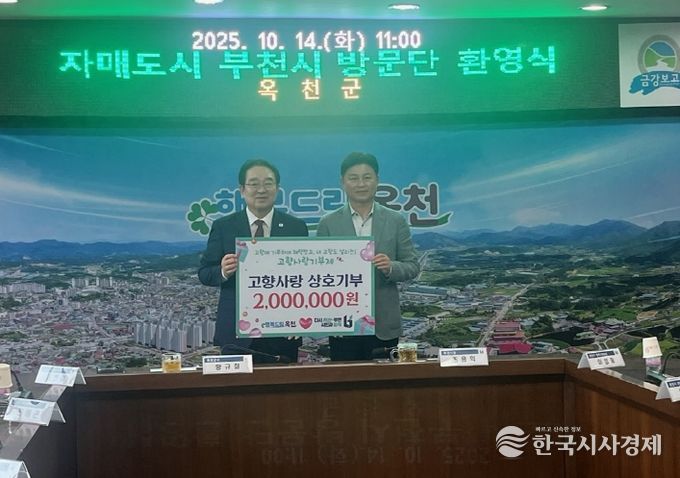 한국시사경제 오영주 기자 | 14일, 조용익 부천시장을 비롯한 부천시 충청권 정책현장 벤치마킹 방문단 24명이 ‘향수의 고장’ 옥천군을 방문했다. 이번 만남은 2002년 자매결연을 체결한 두 지역 간의 우호 증진과 교류 확대를 위한 자리로 마련됐다. 이날 옥천군과 부천시는 각 200만 원의 고향사랑기부금을 상호 기탁하며 두 지역의 발전을 함께 응원했다.