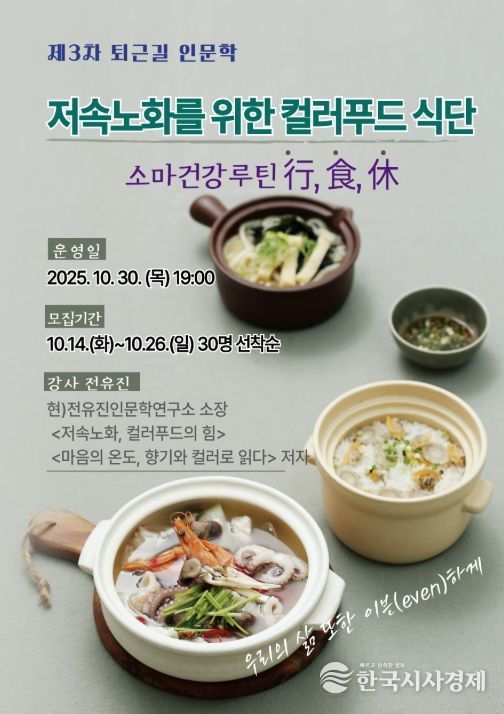 한국시사경제 이정이 기자 | 강원도교육청 정선교육도서관은 10월 30일 직장인, 일반성인을 대상으로 제3차 퇴근길 인문학 ‘저속노화를 위한 컬러푸드 식단: 소마건강루틴(行,食,休)’을 운영한다.