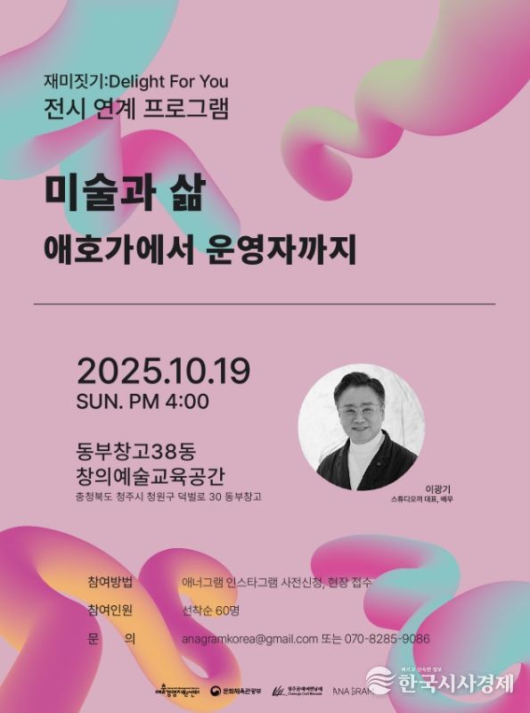 이번 강연은 2025 청주공예비엔날레에서 만나는 신진작가 전시 ‘재미 짓기 : Delight for you(이하, 재미 짓기)’와 연계한 프로그램으로, 미술 애호가에서 아트 스튜디오의 운영자로 예술을 통해 삶의 재미를 풍성하게 지어온 배우 이광기 씨의 세상을 엿보는 기회다.