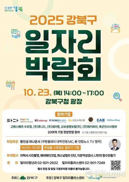 특히 같은 날 오후 2시 강북구청 4층 대강당에서 진행될 취업특강에서는 쿠팡플레이 '대학전쟁' 프로그램 진행자로 잘 알려진 황인성 아나운서가 연사로 나서 ‘취업을 사로잡는 말하기 기법’을 주제로 실전 노하우를 전한다.